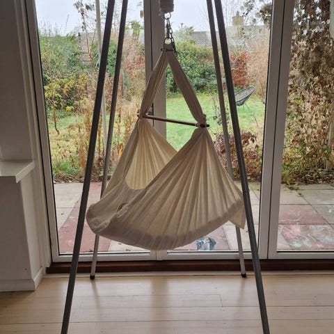 Det er den originale fjedervugge. Vuggen skaber tryghed for det nyfødte barn.