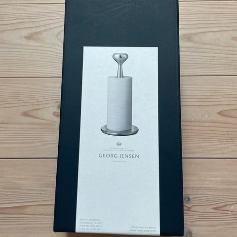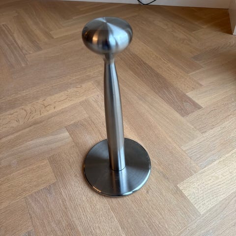 Køkkenrulleholder i stål. 33 cm høj. Perfekt til at have stående på spisebordet, sofabordet eller køkkenbordet. Passer mega godt ind ved siden af Georg Jensen lysestager eller deko i sølv.