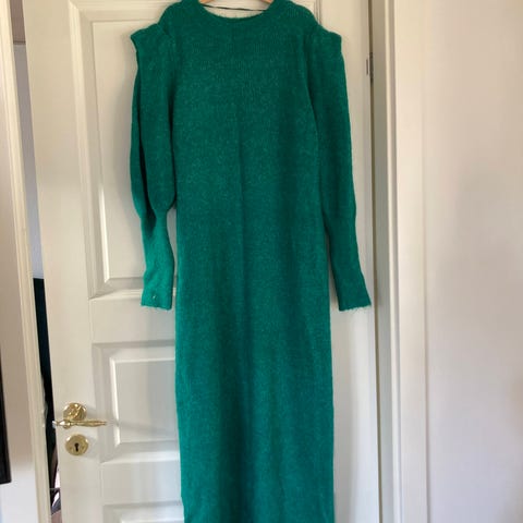 Smart strikkjole uden ærmer i en dejlig blågrøn farve. Brug den med skjorte eller anden bluse under. Længden er 85 cm fra skuldersøm. Materialet er 70% Akryl og 30% uld.