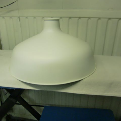 Klassiske danske designer stålskærme, der nyligt er blevet sprøjtelakeret matsort. Diameter 35 cm, højde 25 cm. Fatninger medfølger. I pæn stand.