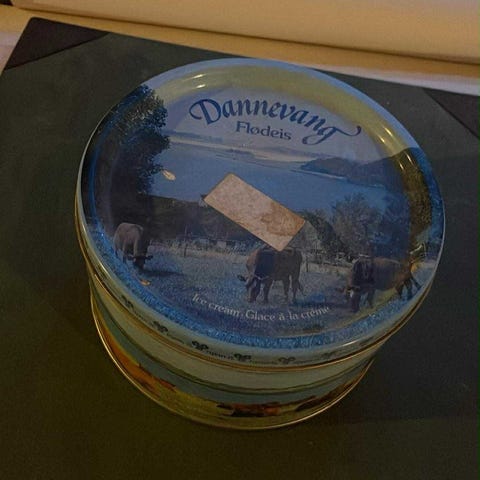 Der har engang været flødeis i, i dag er den en dekorativ dåse til f.eks. din julekager.