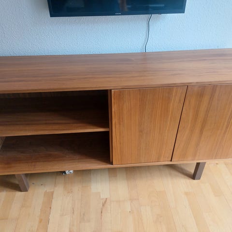 En top lækker skænk / sideboard, fx til TV bord. Godt svensk design i god kvalitet og med greb i valnøddetræ. Fejler intet bortset fra almindelig slid, men den passer desværre ikke i vores nye hus.