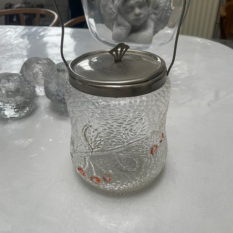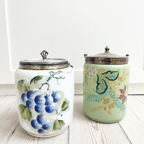 gamle kiksespande, Turkis glas med stedmoderblomster på - har messingkant og 2 hanke