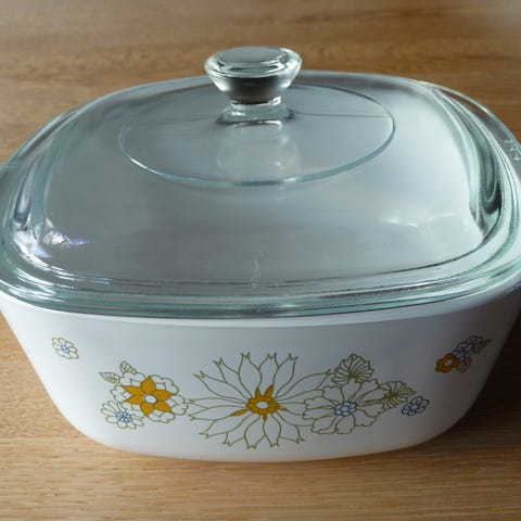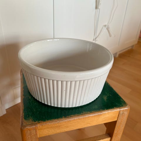 Soufle skål med dybt glaslåg ( låget kan bruges som skål) indvendig dia 22 cm, h 7,5 cm låg indv dia 20 cm, h 4,5 cm. Låg har lidt brugsspor, skål er fin hvid kun lidt gult i kant ved ene håndtag (se fotos) billig samlet pris 60kr.