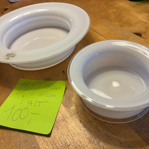 2 flotte blomsterskåle/fade i kraftig kvalitet. Ingen skår. Enkelte ridser i bunden, der kun ses ved grundig inspektion. Kan bruges til mad, skåle eller med lys. Virkelig fine