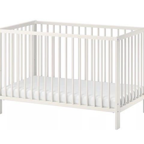 Babyseng med madras. På billederne er sengen skubbet ud. "Siderne" står ved siden af. Madras og sengerand som ny medfølger, hvis ønskes