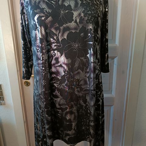 Nypris 400. Tunika med lommer og krave for og pynte knapper og slids bagpå. Bm 2x60 +Stræk hofte 2x62 længde 98. Polyester og elastan.