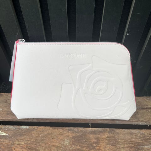 Helt ny og ubrugt toilettaske/kosmetiktaske med lynlås fra Lancome, farven er offwhite, måler ca. 25 cm i længden og 20 cm i højden.
