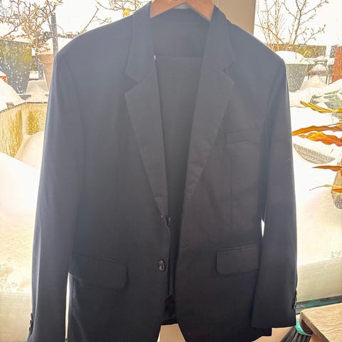Det er syet efter mål og der står derfor ikke størrelse i, eller mærke i. Talje kanten er ikke den pæneste indvendig men det ses jo ikke når det bæres. fremstår flot og pænt ellers
