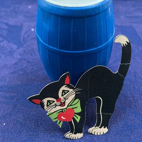 Gammel “farlig” Fastelavnskat, Nok fra 60’erne, dengang katten til fastelavn måtte være “ sur “ og denne er i ret stor størrelse. Se andet opslag med nyere glade papkatte i forskellige størrelser og andet pynt til fx. Et hjemmelavet fastelavns ris, måske med sundere slik eller hvad du nu syntes.