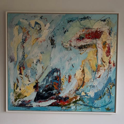 Helt klar i farverne. Hængt i ikke ryger hjem. Måler 60x60 cm.