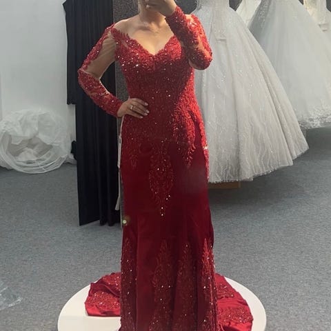 Smuk rød galla kjole i 2 dele. Foret både i top og nederdel. Overdelen kan justeres i størrelsen. Pyntet med broderier og sten.