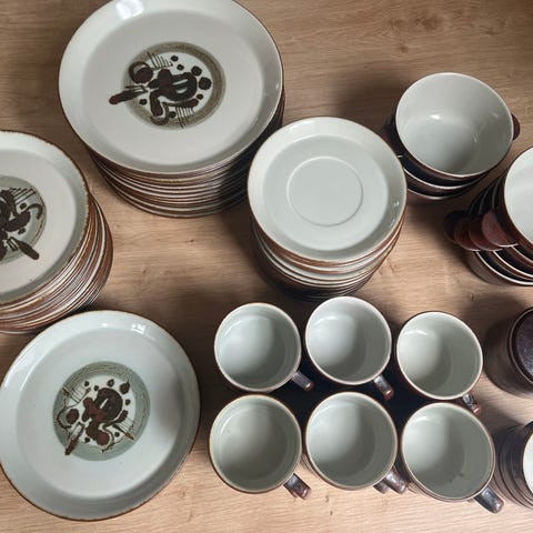 Flot håndmalet design i brunlige nuancer med et karakteristisk mønster på tallerkenerne. Perfekt til en retro- eller vintageinspireret borddækning.