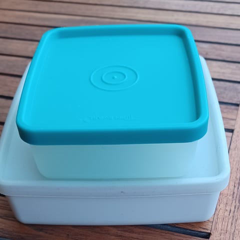 3 Stk tupperware plast bøtter - brugsspor /slidte / misfarvning på den ene — ca 16 cm i diameter —. Højde med låg ca 3 cm og ca 5 cm —. Kan sendes for 47 kr