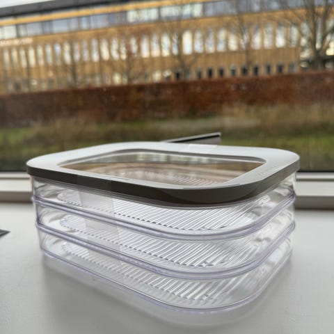 * Mepal Modula opbevaringsboks, som indeholder 3 beholdere af 0,55 Liter, samt 1 låg, da bøtterne kan stables.