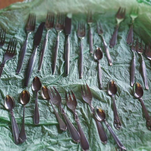 Sølvplet serveringsdele med forskellige størrelser og mønstre.