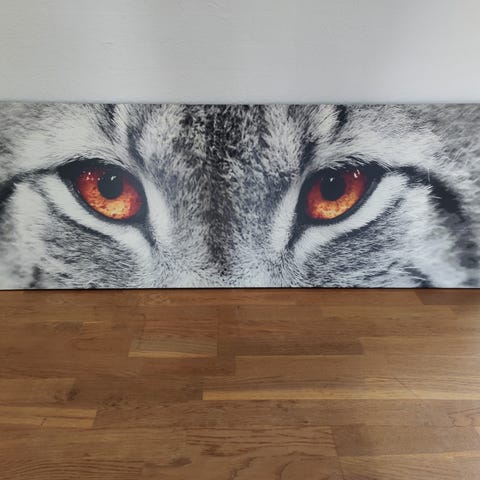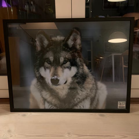 Indrammede glansbilleder af ulve. Rammerne er af sort plastik.