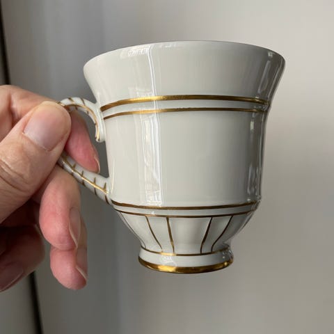 Offenbach er af hvidt porcelæn med et mønster af linjer, der er præget i porcelænet. Dekoreret med ringe af guld.