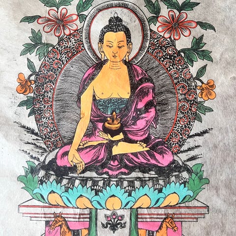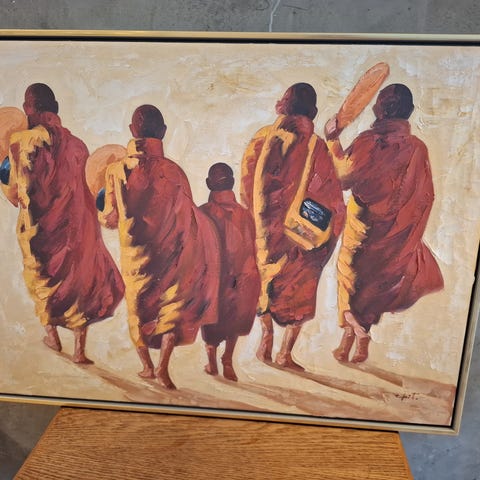 Buddhistisk motiv, malet, i passepartout og ramme. Mål med ramme: 26,5×32,5 cm Mål i passepartout: 15,4×20,4 cm