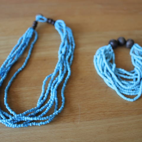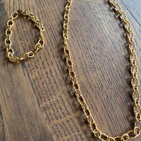 Halskæden er 55 cm lang, og armbåndet er 20 cm lang