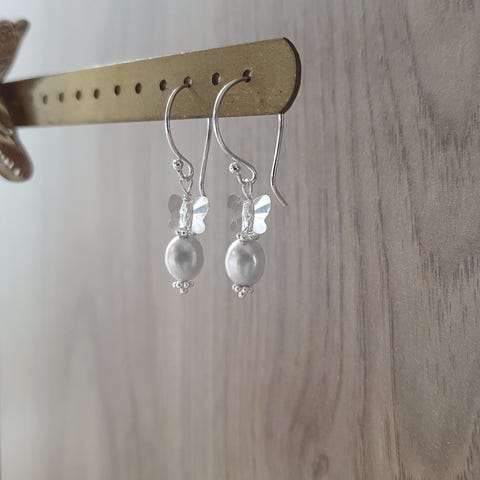 Fine øreringe fra Dige Designs i 18K forgyldt sølv, som er dekoreret med oliven-farvede ferskvandsperler og glimtende Swarov... krystalsommerfulge. Øreringene er 2,5 cm lange og nikkelfri. Helt nye og fin gaveindpakning medfølger.