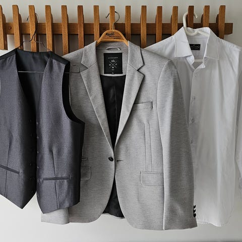 Brugt x 1. Jakkesæt str 56, skjorte str L. Mærket er lindbergh. Nypris 2000kr. Min søn var ca 190 da han brugte det.