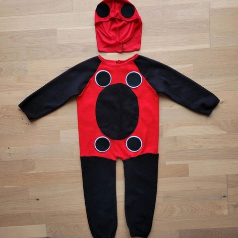 Mariehønekostume. Er usikker på størrelsen, men der er lidt over 40 cm fra skulder til skridt. Måske omkring str 82 til 86?