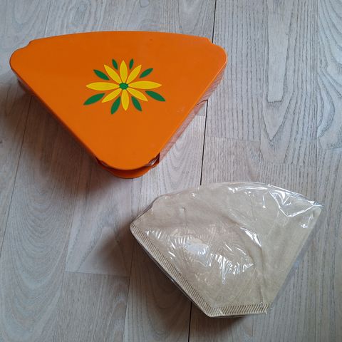 Retro kaffefilterholder i keramik (18×13×4,5cm) sælges. Dannebrogs-klistermærket kan efter behag fjernes. Der er mindre afslag på bagsiden, som ikke ses ved ophæng på væg.