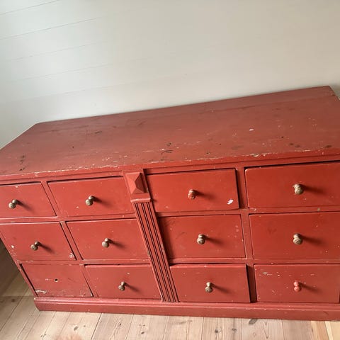Købmandsdisk, 100 år gl., b: 72 d: 40 h: 84, Antik del af en købmandsdisk. Charmerende kommode med 10 skuffer og den rette patina. Proveniens er fra en købmandsbutik jf. antikforhandler i Lønstrup, over 100 år gammelt.