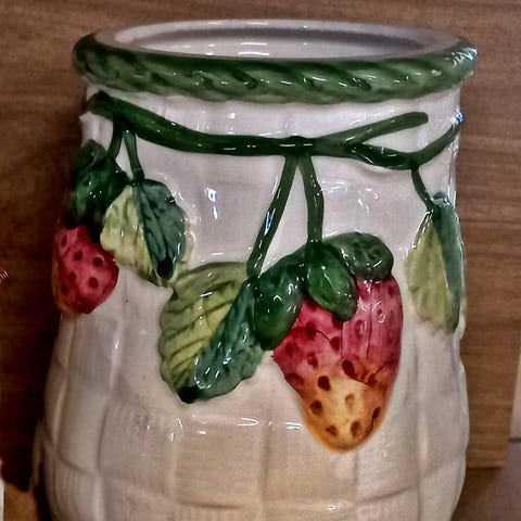 Alle 3 krukker med låg og frugt-motiver sælges samlet til kr. 60.