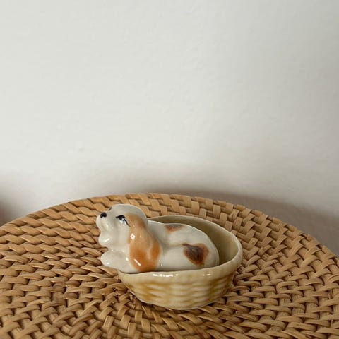 Hund til pynt i sættekasse størrelse - højden er 5 cm.