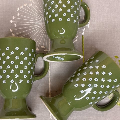 5 smukke Krus på fod og med hank fra Sødahl - Forglemmigej. Farve: Grøn med små blomster. Alle 5 er fine intakte og uden skår. Højde 13,5 cm. Diameter 7 cm. Se alle fotos. Sælges samlet for 199 kr. Kan afhentes på bopæl i Viborg eller sendes forsikret med DAO + porto. Se gerne mine andre annoncer.