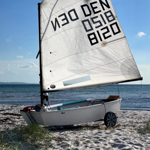 Hjemmelavet transportrør til sejl+rig kan medfølge. Jollen kan ses i Holstebro.