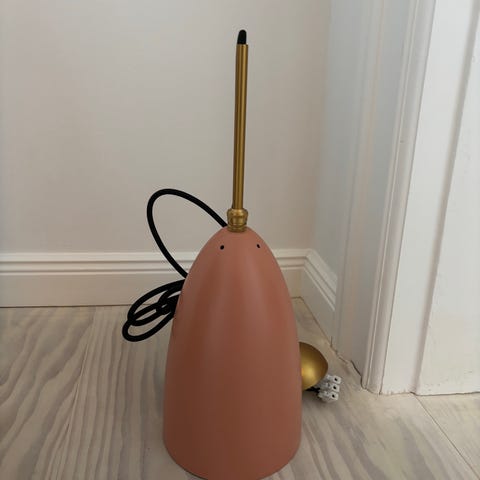 Pæn stand med få overfladiske brugsspor. Så svage, at de er svære at fotografere. Vi har forlænget lampens ledning under baldakinen, så man får ekstra lang ledning med og en stikprop. Ekstra ledning og stik kan nemt demonteres igen, hvis man ønsker det.