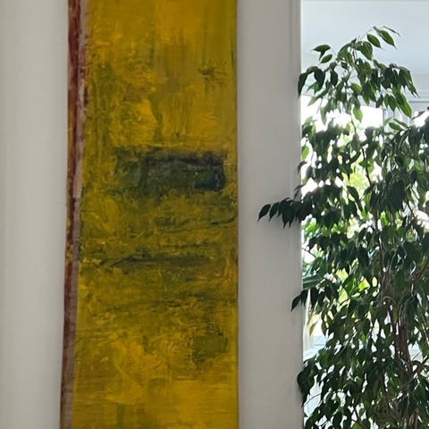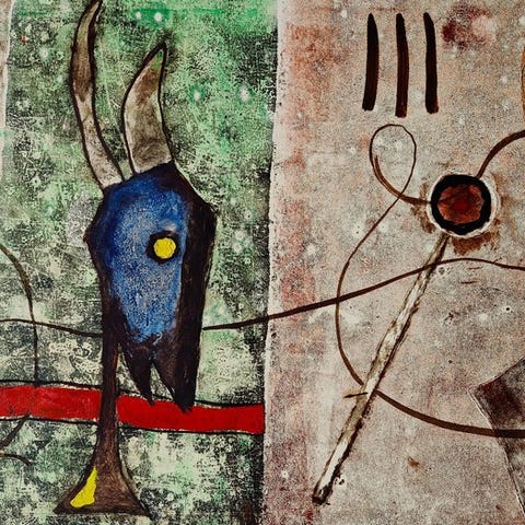 Maleriet er skabt på en metalplade med en spændende reliefstruktur og malede detaljer. Teknikken er ukendt, men det har et råt, industrielt udtryk kombineret med stærke farver.