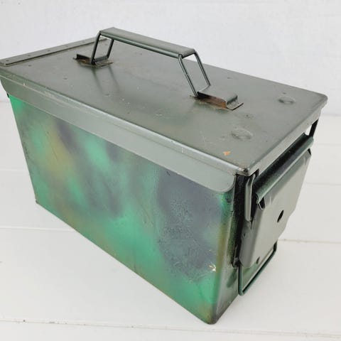En fin kasse, til hjemmebaren, hvor meget af indholdet mangler. Der er kun 3 glas, samt 1 håndgranat i glas tilbage. Se de 2 sidste billeder, hvordan den oprindelig så ud. Mål: L: 65 cm - B: 24 cm - D: 9 cm
