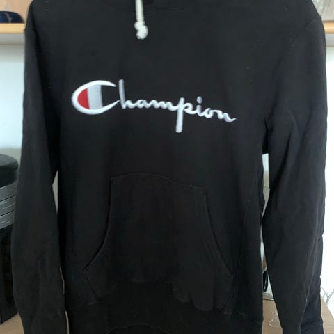 Sort Champion hættetrøje. Almindelig brugsspor uden huller. Str M, men er lille i størrelsen, så passer nærmere str S