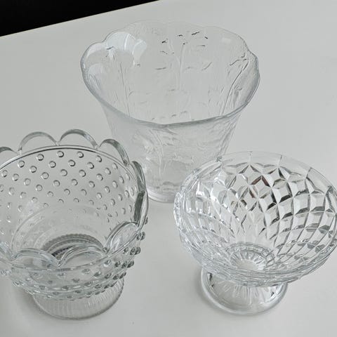 19 fine små glasskåle. Til feks Tapas, nødder, dip mm. Kan bruges som lysestager. Har lille kant så med lidt ståltråd kan de også komme op og hænge.