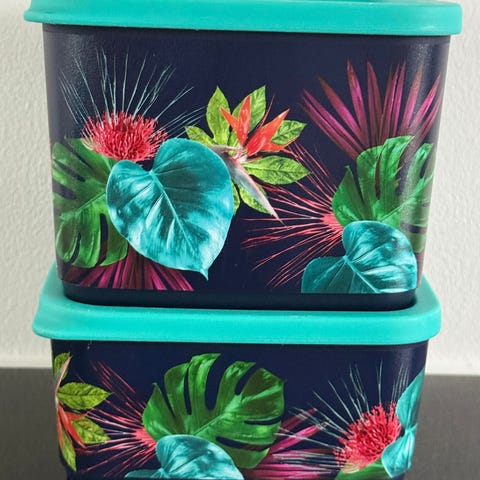 6,5 dl med tætsluttende låg. ( 13 cm x 13 cm x 6½ cm).