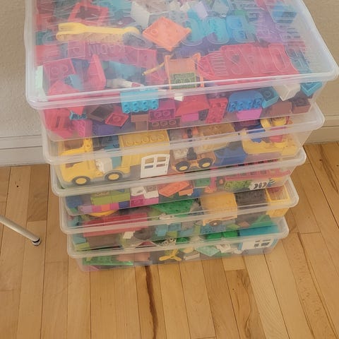 Stor skraldesæk med duplo sælges . Dyr, biler ,tog med skinner, bus, Hustage mm.