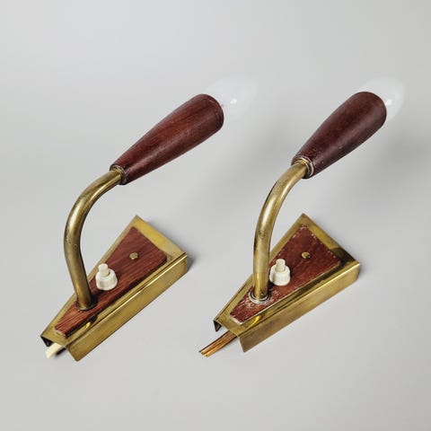 2 teak væglamper. Lamperne har indbygget trykafbryder. Dette er et sjældent fund, med teak og messing.