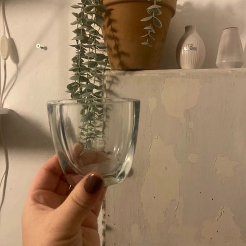 1 stk. vase med afrundet kant og indgraveret drueklase-motiv. Har to små ubetydelige afslag langs inderkanten i åbningen. Ses ikke, når der er blomster i vasen.