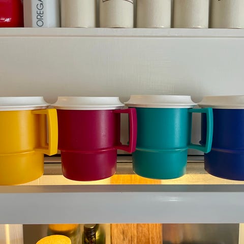 Orginale Tupperware krus i den bedste kvalitet. Jeg har 13 stk af den gammel slags - rent retro i sarte pastel farver. Der er ganske få brugsspor - intet af betydning.