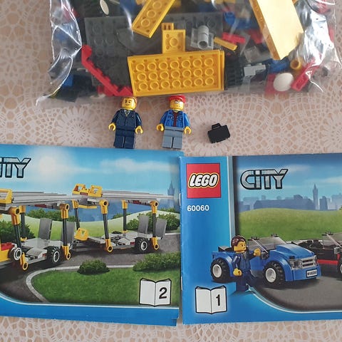 Lego bil med flyvemaskine på trailer fra 1975, komplet med alle klodser og en slidt samlevejledning.