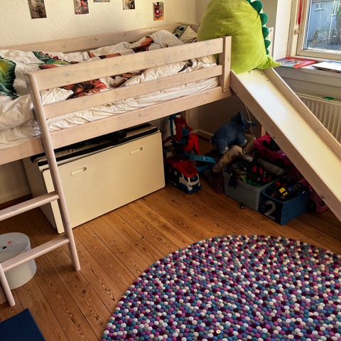 Børneseng med rutsjebane. Købt brugt, men ej brugt her. Indeholder ny madras.