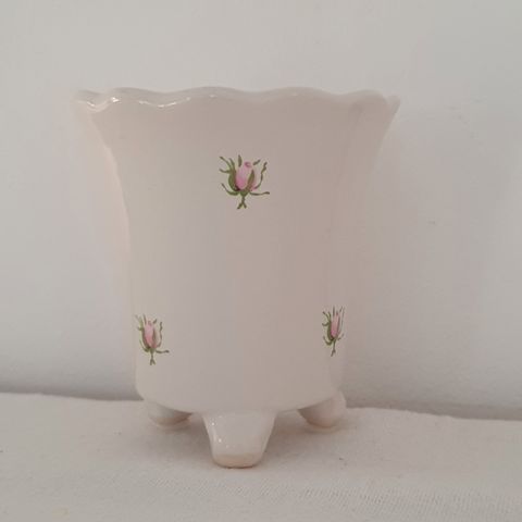 Lille keramik krukke med rosa/lyslilla glasur. Den er brugt men fin som næsten ny. Den har ingen skår, revner eller misfarvninger. På den øverste kant har den en lille "medfødt" fejl i glasuren. Se sidste foto.