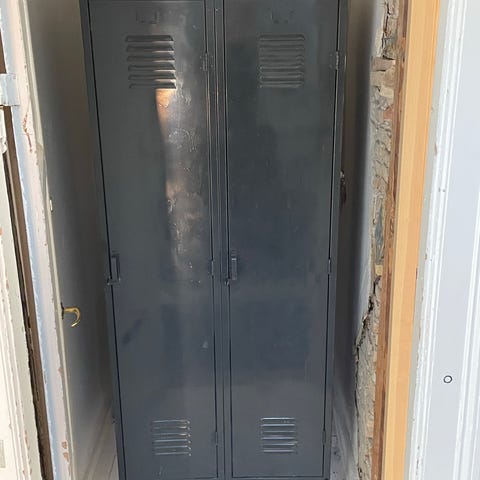 Metalskab, Fint gammelt metalskab med hylde, låger og skuffer med porcelænshåndtag.