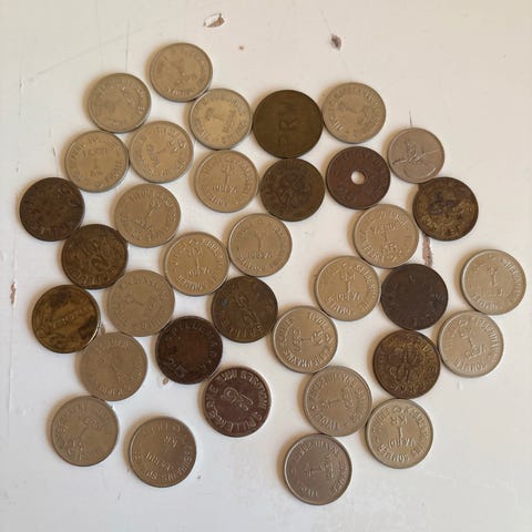 Andre samleobjekter, Spillemønter, En æske med mange spillemønter. Forskellige motiver på mønterne. Pris pr stk kr 10. Kan sendes efter aftale