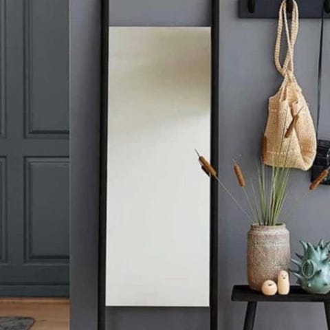 Super smukt asymmetrisk spejl fra Design by Us. Rammen er lavet i massiv sortmalet egetræ med. På spejlet er der påsat en læderstrop til at hænge spejlet op med. Dette gør at du selv kan bestemme hvilken retning spejlet skal hænge, og gør spejlet fleksibel i forhold til pladsen.