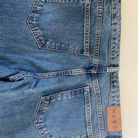 Jeans, Never Demin, str. 30, Blå med sort hul mønster foran, Bomuld, God men brugt, Et par jeans med indsyede huller foran. Livvidden er maks 80cm. Sendes for købers regning eller hentes her